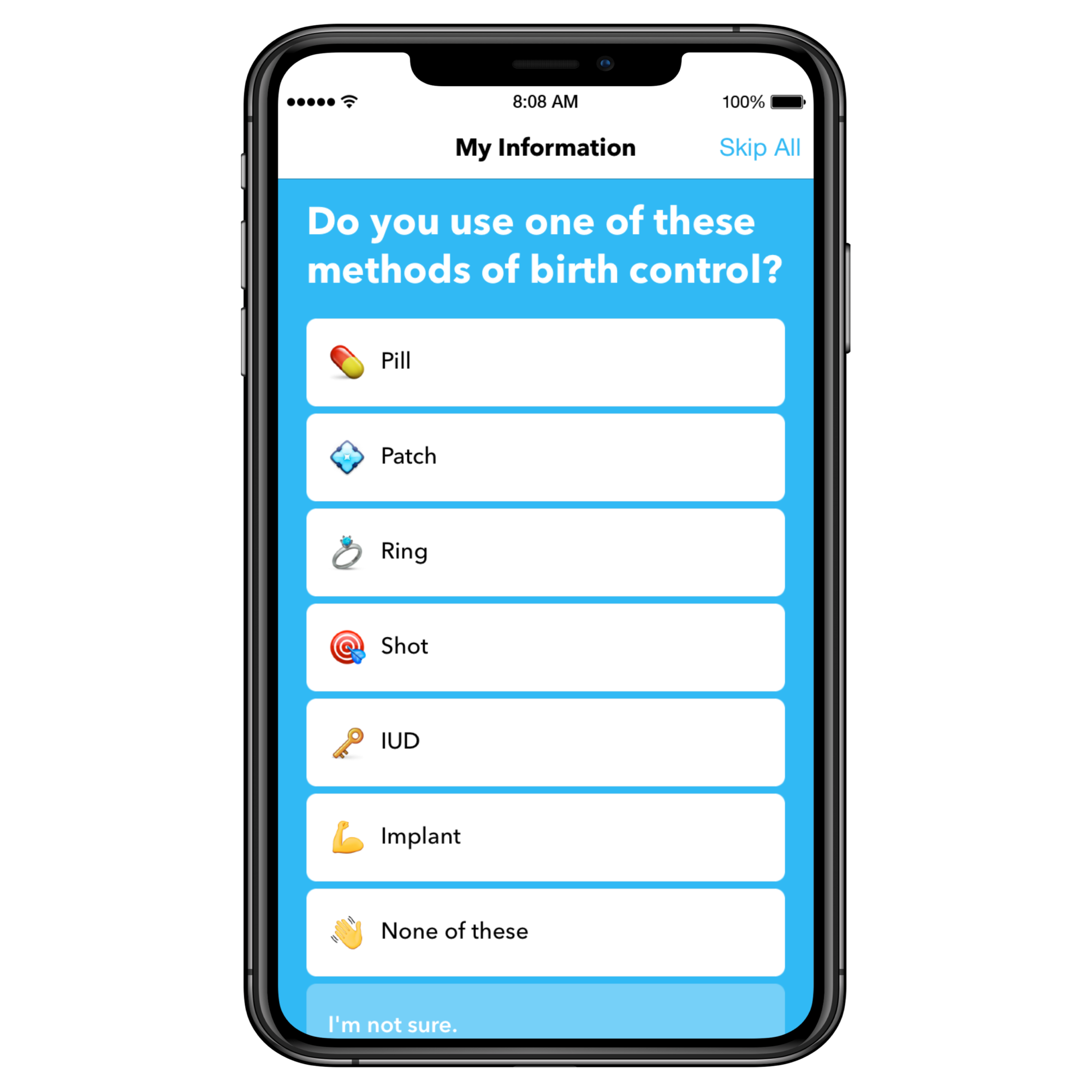 Spot On embraces a bold visual and textual tone of inclusivity and gender neutrality, avoiding the traditional heteronormative approach to providing sexual and reproductive health information (no pink flowers here). The app makes no assumptions or judgments about the identity, gender, sexual orientation, or motivation of the user. While most of Spot On’s competitors were designed for users trying to get pregnant or track their fertility, Spot On was designed to support a diverse range of reproductive health goals and behaviors, including to support the 9 in 10 women who will use contraception at some point in their lives.